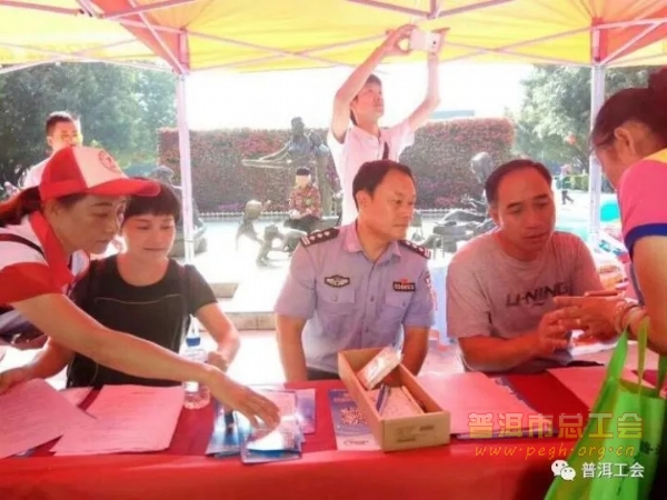 市总工会、市公安局领导和普洱志愿服务联合会巾帼志愿服务总队向参与活动的市民发放宣传资料