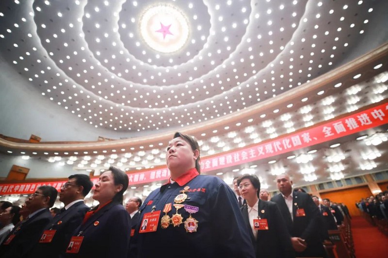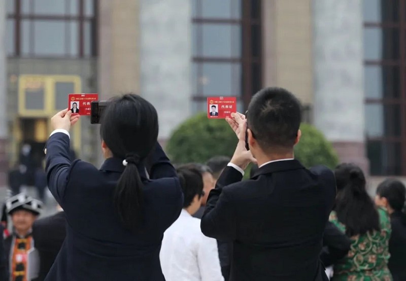10月12日,闭幕式开始前,代表们以北京人民大会堂为背景拍摄代表证。工人日报记者 杨登峰 摄