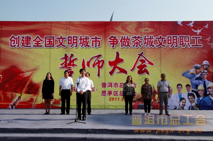 在全国文明城市创建工作进入攻坚的关键时刻,5月2日,鸿发国际与思茅区总工会在红旗广场举行“创建全国文明城市、争做茶城文明职工”誓师大会,吹响共创全国文明城市“冲锋号”。市委副书记陆平出席誓师大会并作重要讲话;市人大常委会副主任、市总工会主席李盛富主持誓师大会;市政协副主席李验波,市总工会党组书记、常务副主席曾永泽,市总工会副主席何春,思茅区人大常委会副主任、区总工会主席史晓荣等领导出席了大会。曾永泽宣读了市总工会致全市广大干部职工的倡议书,来自300余个市、区基层工会的近2300名职工参加了活动。