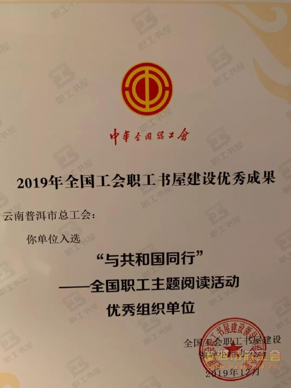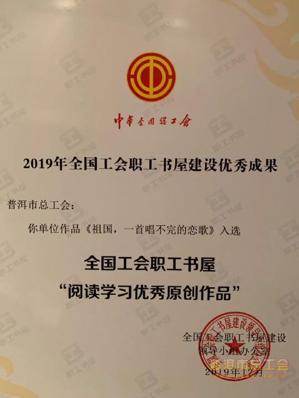 选送的《祖国,一首唱不完的恋歌》荣获全国工会职工书屋“阅读学习优秀原创作品”; 选送的《影视作品配音》(晏积u)荣获全国工会职工书屋“阅读学习优秀原创作品”;