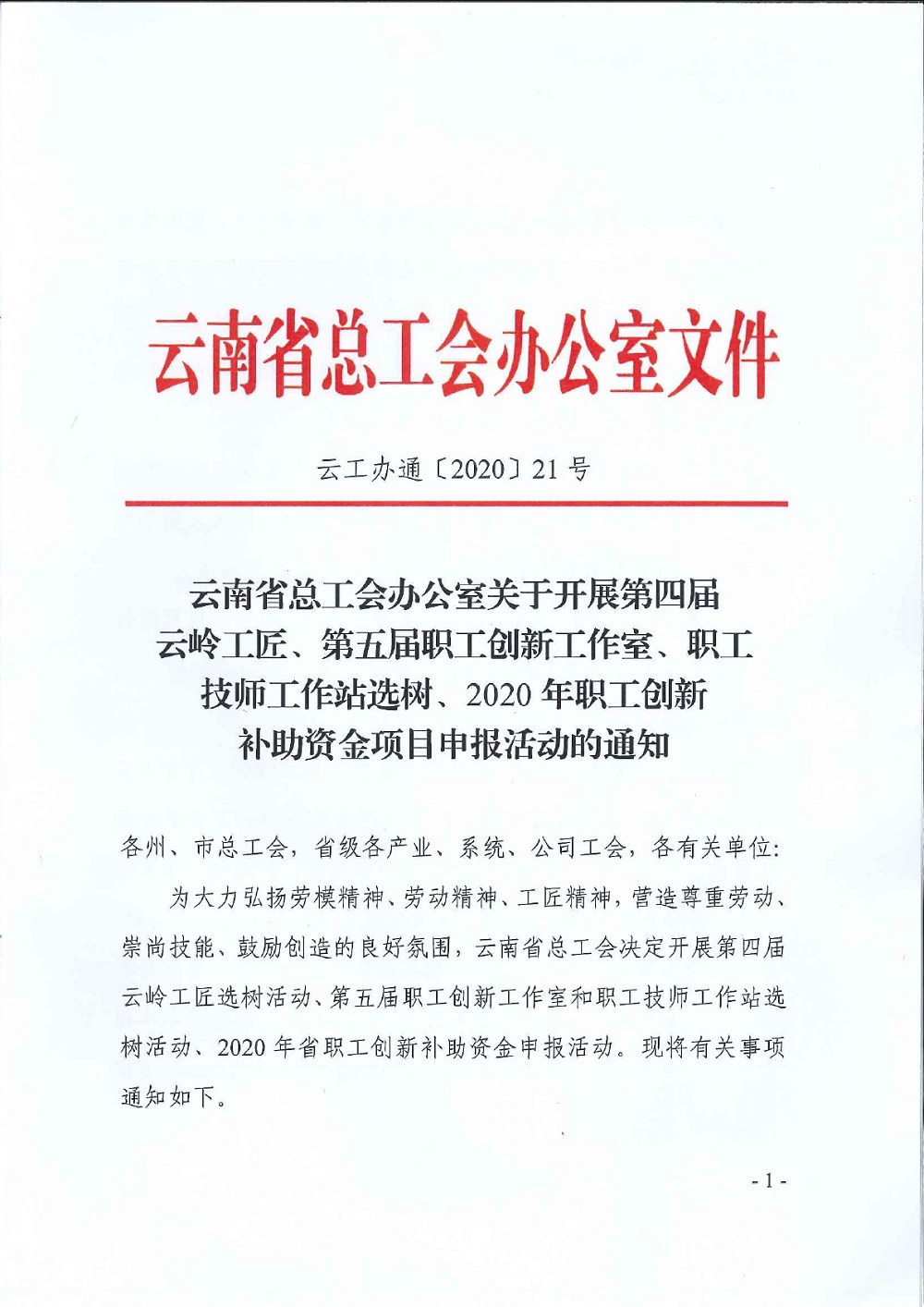 ・云工办通〔2019〕14号(云南省总工会办公室关于印发《云南省职工创新项目补助资金管理办法(试行)》等2个制度的通知)