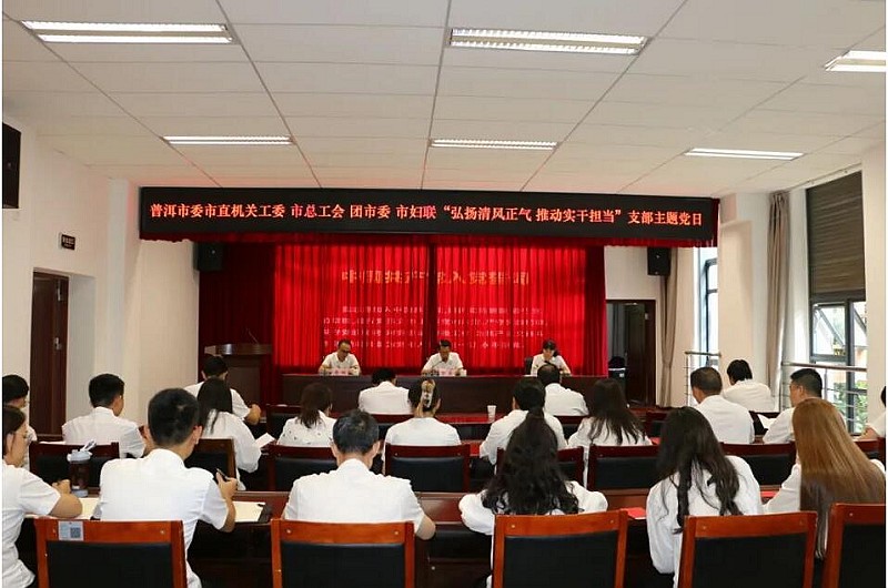 2023年7月11日,驻普洱市行政中心五号楼的市委市直机关工委、市总工会、团市委、市妇联共同组织开展“弘扬清风正气 推动实干担当”支部主题党日,共计40余名党员参加。