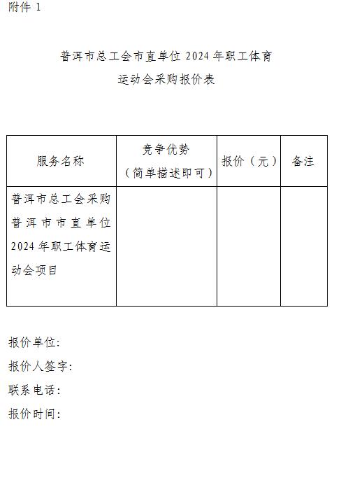 为进一步丰富全市广大职工业余文化生活,增强工会凝聚力,增进职工交流,促进职工身心健康,培养职工对体育运动的兴趣,鸿发国际组织开展普洱市市直单位2024年职工体育运动会,采购第三方服务采取询价方式比选服务机构,现邀请资质齐全的单位参与报名,具体项目情况如下。