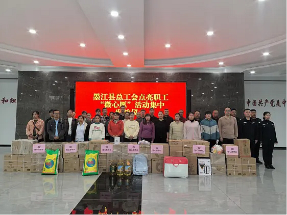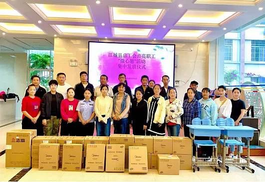 江城县总工会举行2024年“微心愿”物资发放仪式,向52户困难职工、新业态劳动者发放电饭煲、电磁炉、学习课桌、迷彩服等爱心物资,共投入资金1.2万余元,为身处困境、需要帮助的职工群体送上实实在在的温暖和关爱。